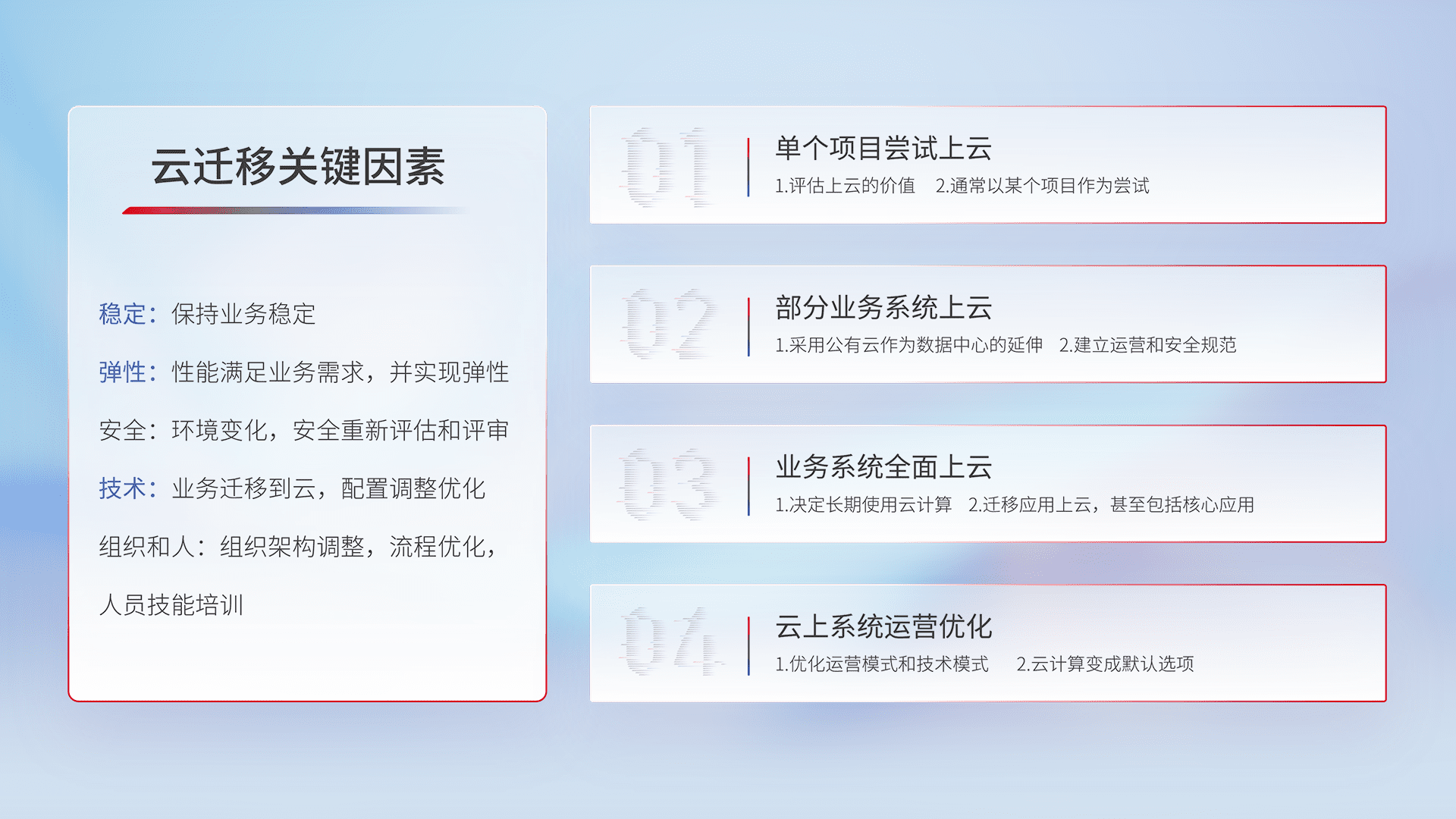 结合实际业务,,从规划设计、、云平台选型、、云原生改造、、、数据迁移、、、、集成交付,,,迁移全过程为客户识别最佳上云路径,,,,做好风险识别管理,,,,设计网络架构、、身份权限、、、、安全审计合规、、、、操作审计、、、、日志审计、、、、监控告警策略、、、多站点容灾设计等,,对云上基础设施进行整体规划,,提升IT治理水平,,以满足弹性、、、高可用、、、高性能的需求。。。。