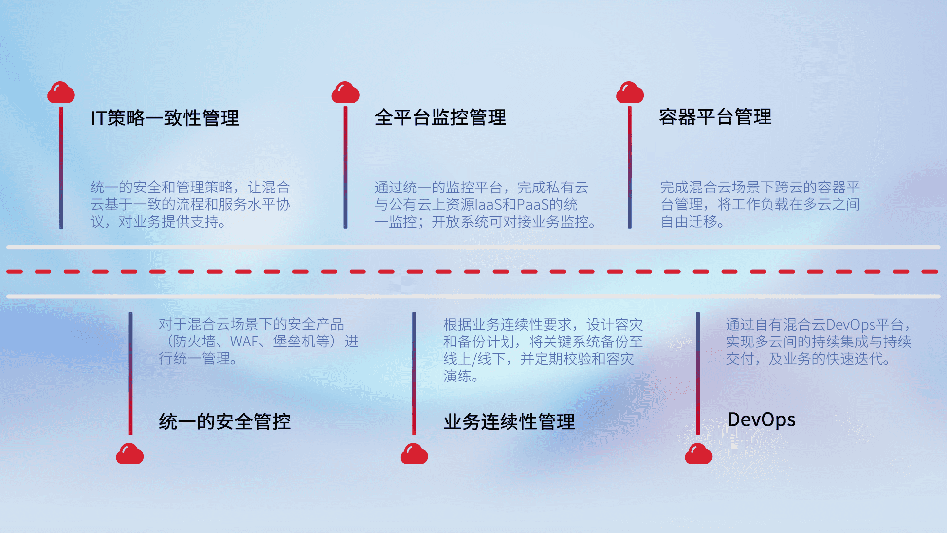 通过多云纳管,,以统一的资源数据模型把客户的云资源进行抽象和封装,,进而实现对多云资源的统一操作,,,,保障云资源管理的可靠性、、、稳定性与可用性。。。。量身定制化运维内容,,,配置、、、、开发运维、、补丁管理、、、、备份、、、监控、、、认证和访问管理、、审计和日常巡检等,,保障在用云过程中的可靠度,,,稳定度以及高可用率。。