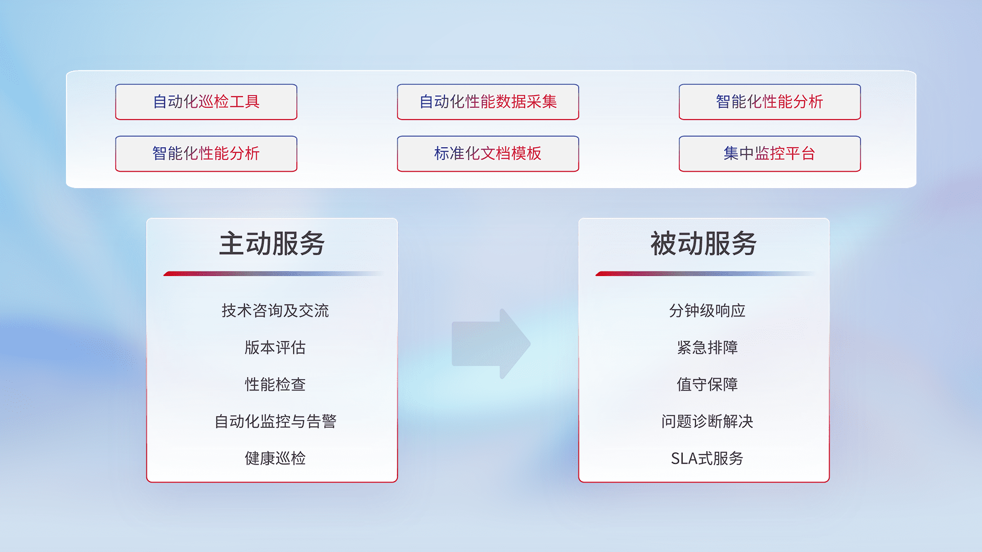 智能化工具和标准化文档,,保障服务质量,,,提供主动服务(包含技术咨询、、、、版本评估、、性能检查、、自动化监控与告警、、、健康巡检)和被动服务包含(分钟级响应、、、紧急排障、、、值守保障、、、、问题诊断解决、、SLA服务)。。。。